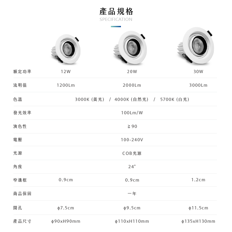 色溫: 3000K/4000K/5700K