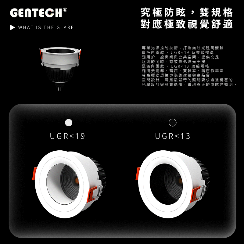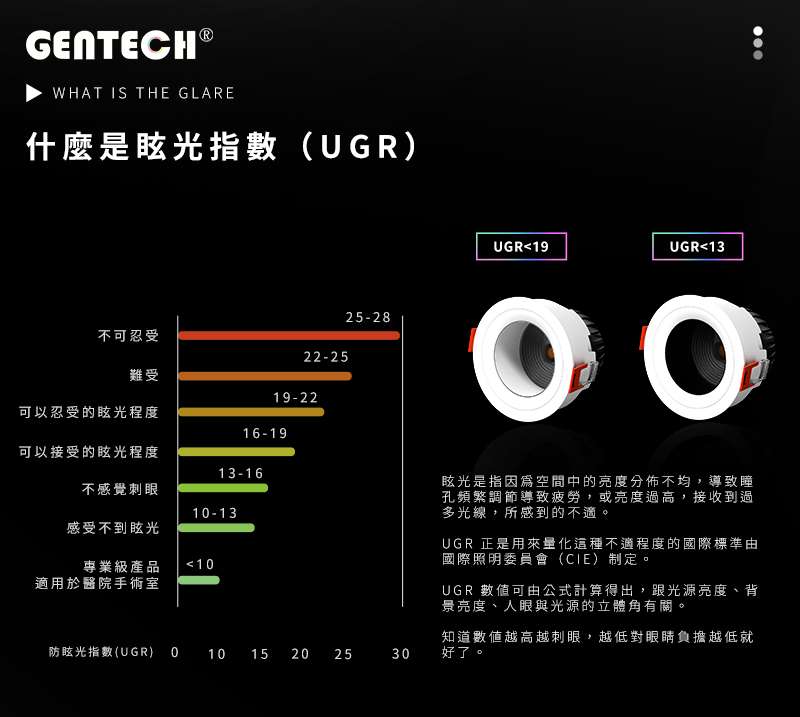 嚴格控制UGR值低於19,有效消除視覺疲勞與眩光干擾。