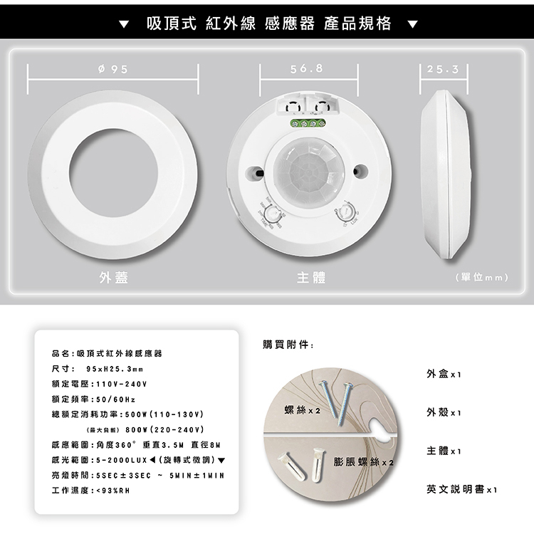 吸頂式 紅外線感應器 省電、方便、嚇阻、安全