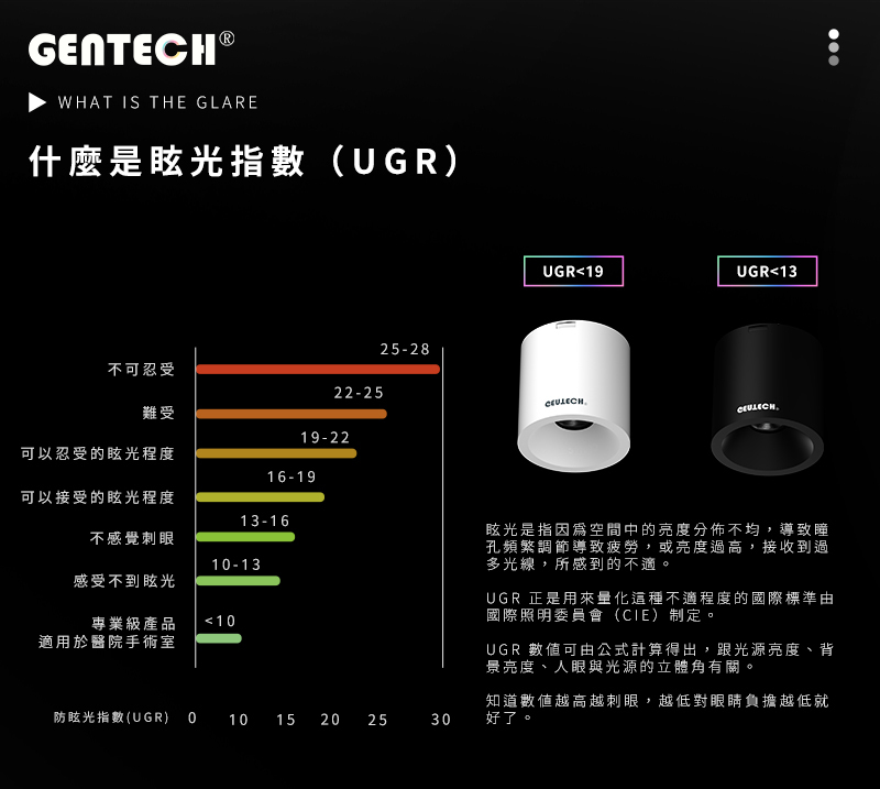 嚴格控制UGR值低於19,有效消除視覺疲勞與眩光干擾