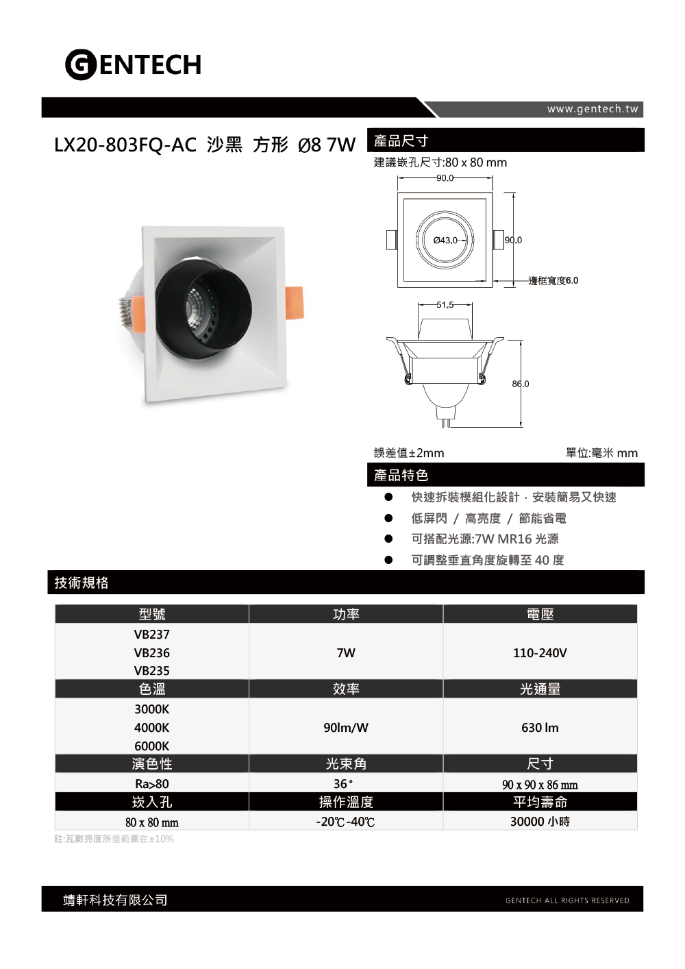 品名:803FQ-AC Brian崁燈 8*8cm 沙黑