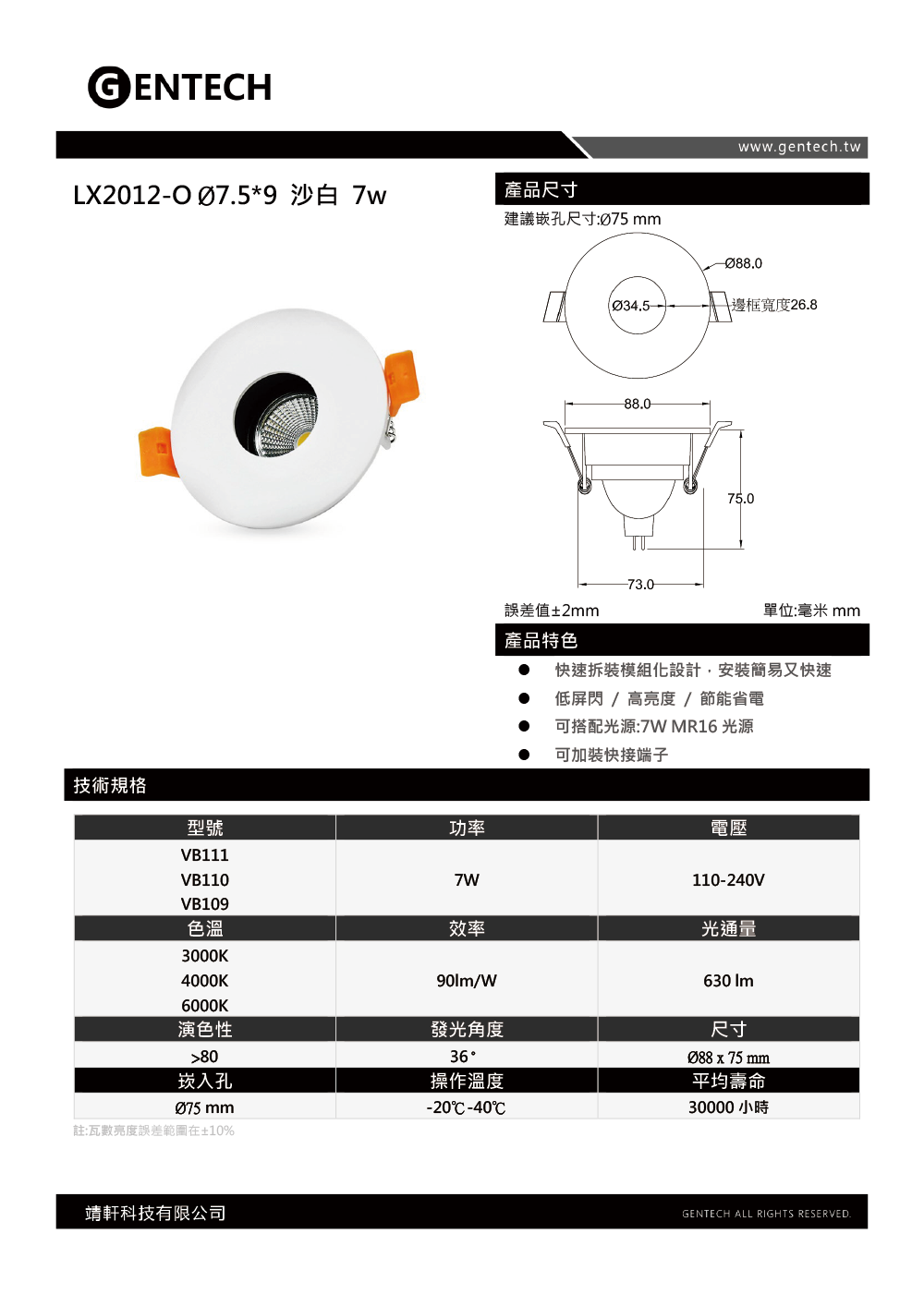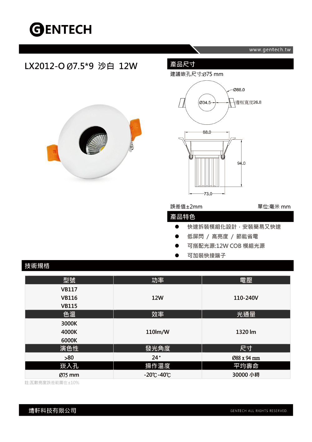 品名:2012-O Brian崁燈 7W/12W 7.5cm