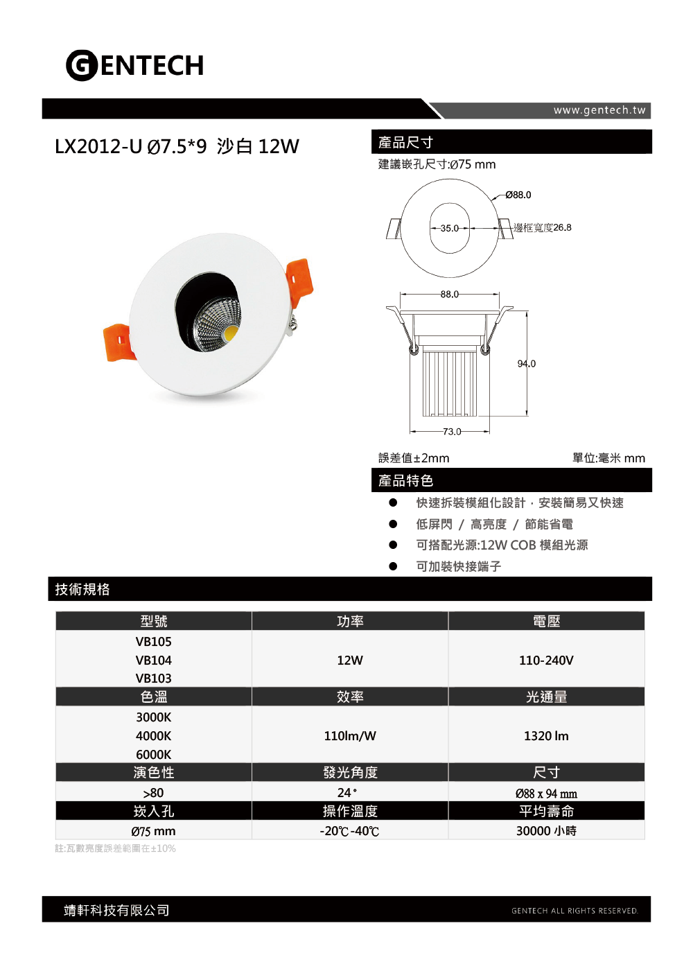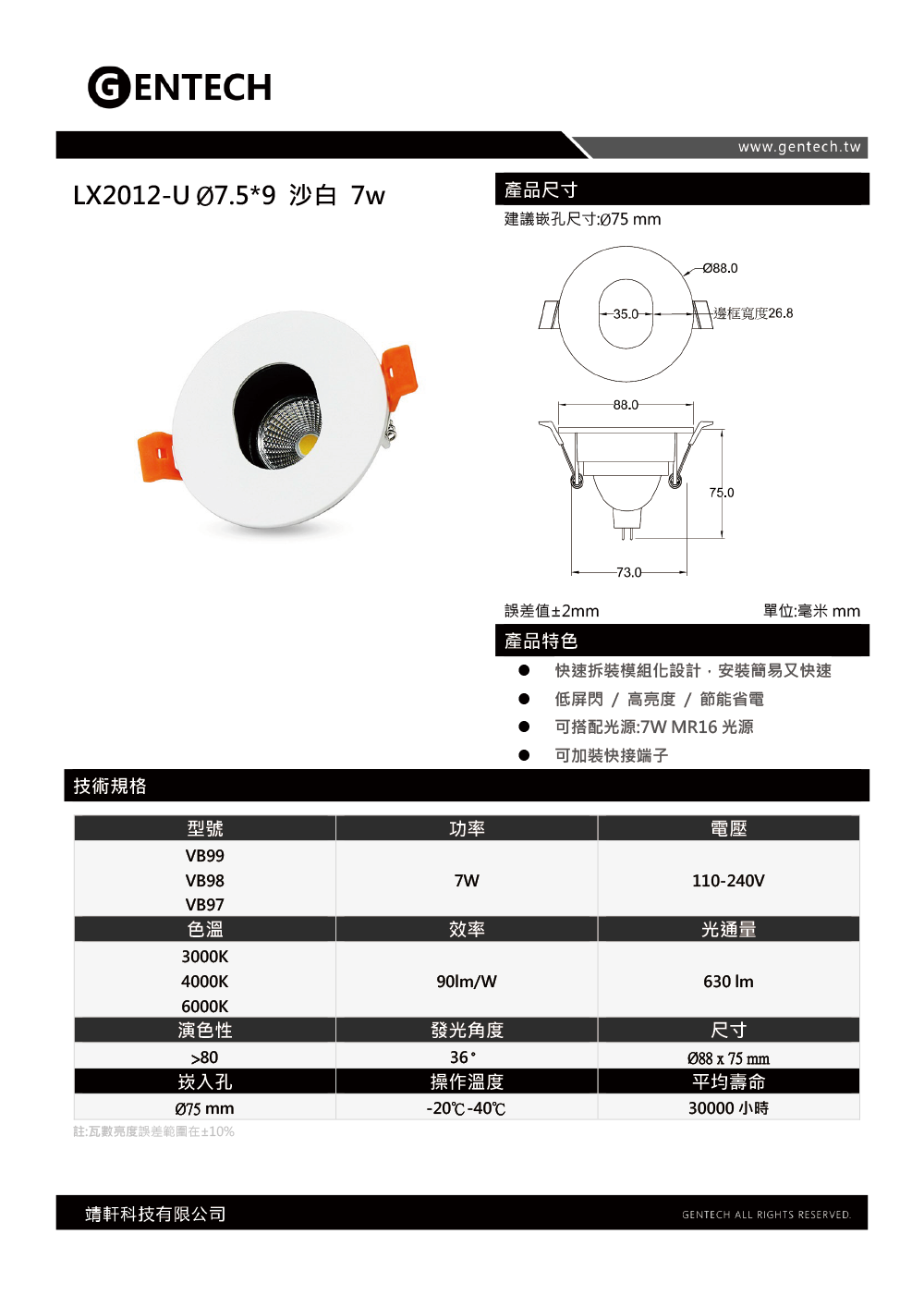 品名:2012-U Brian崁燈 7W~12W 7.5cm
